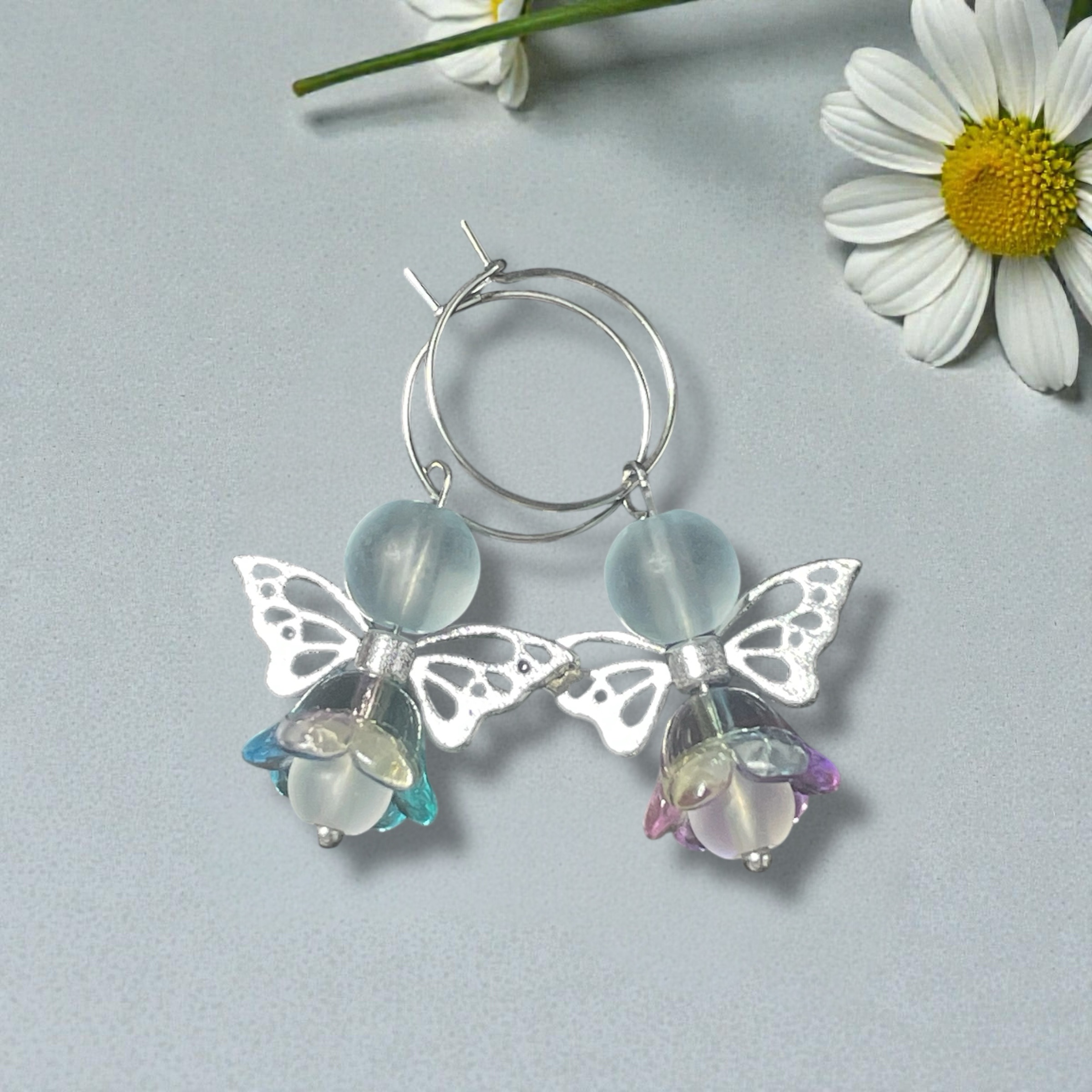 Teräs, siivet sinkkiseos, kukkahame lasi ja huurteiset lasihelmet.