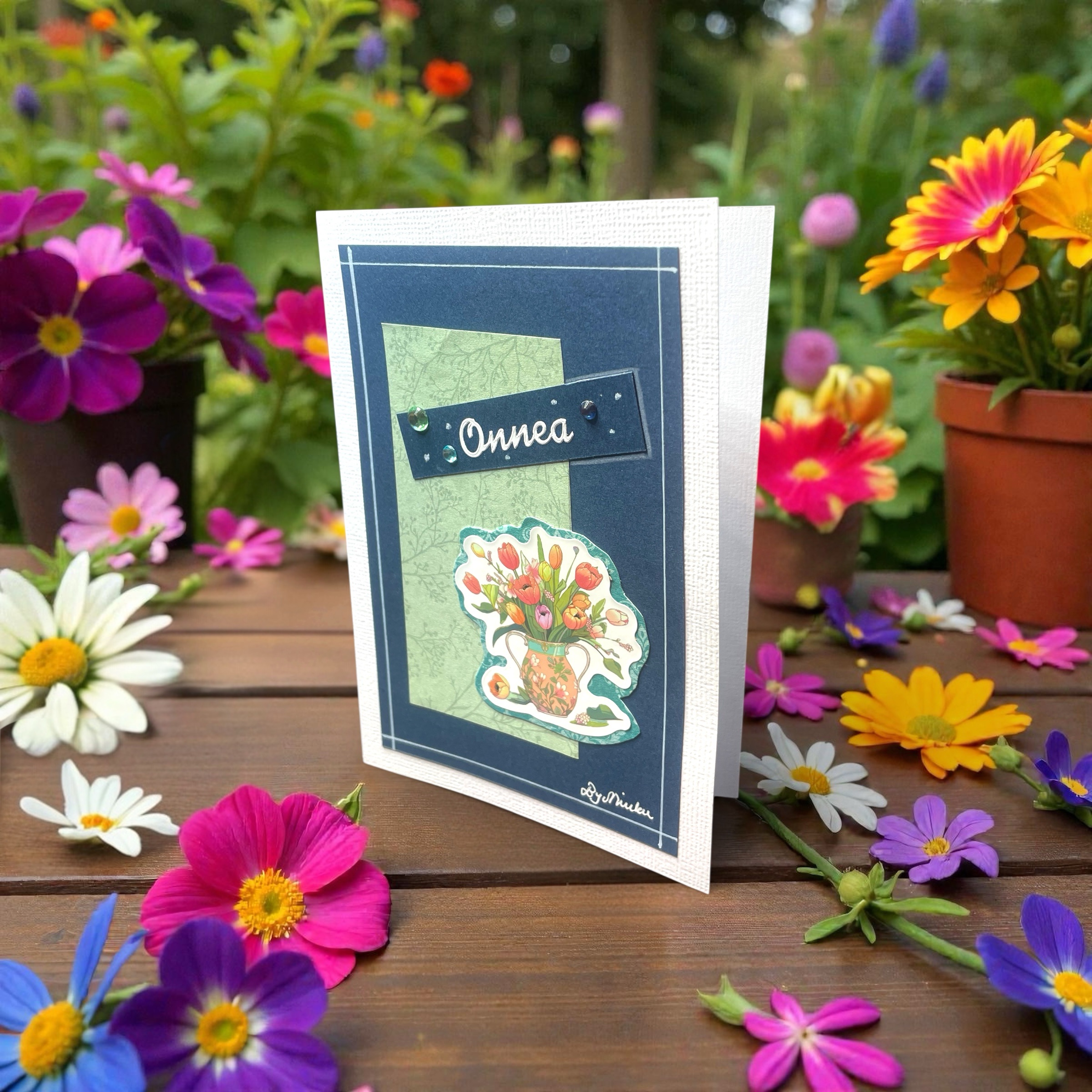 Kortin sisäpuoli tyhjä, joten sinne voi vapaasti taiteilla onnittelut ja tervehdykset.